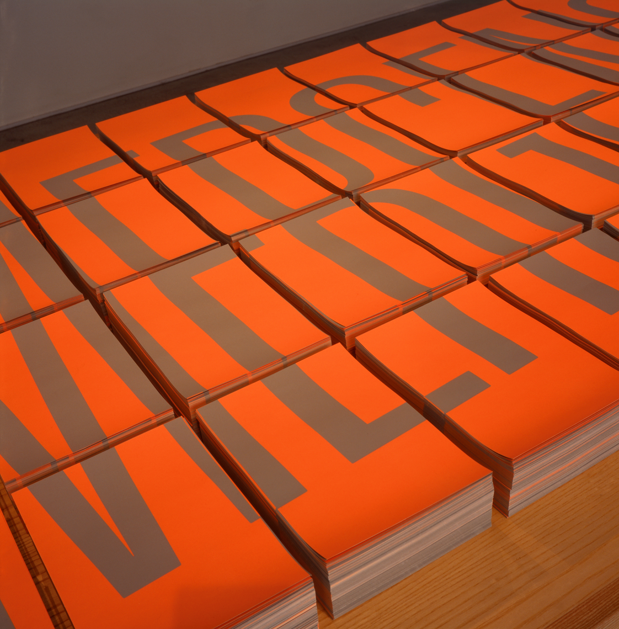 Emergency presented on a table, is composed of 48 piles of A4 paper forming 500 surface of the word “emergengy” screenprinted in orange on a grey background and alternately in grey on an orange background.